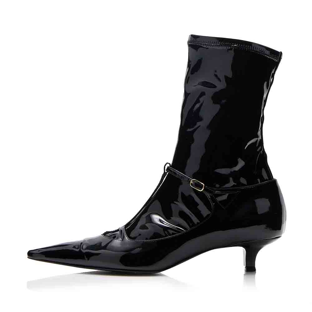 Step up your style with these chic Black Pointed Toe Patent Leather Kitten Heel Buckle Mid-Calf Boots. The sleek design features a pointed toe, patent leather finish, kitten heel for comfort, and buckle detail for added flair. Elevate any outfit effortlessly with these sophisticated boots. Color: Black Material: Patent leather Heel Type: Kitten heel Heel height: 1.57" / 40 mm approx Product measurements were taken using size 8. Please note that measurements may vary by size. Toe: Pointed toe Adjustable buckle strap design. Handcrafted US sizing. Fits true to size.