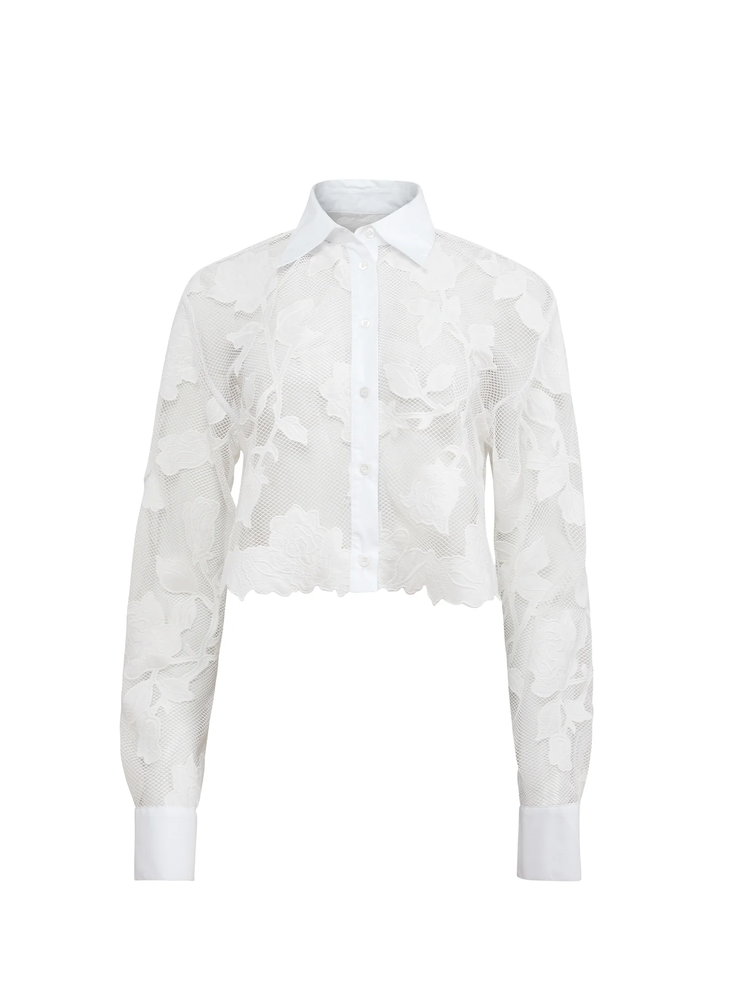 Our Collette Cropped Shirt, with floral embroidery on breathable netting with cotton poplin collar and cuffs. Comfortable fit with button closure. Cropped length. Pair with the matching Collette Short.