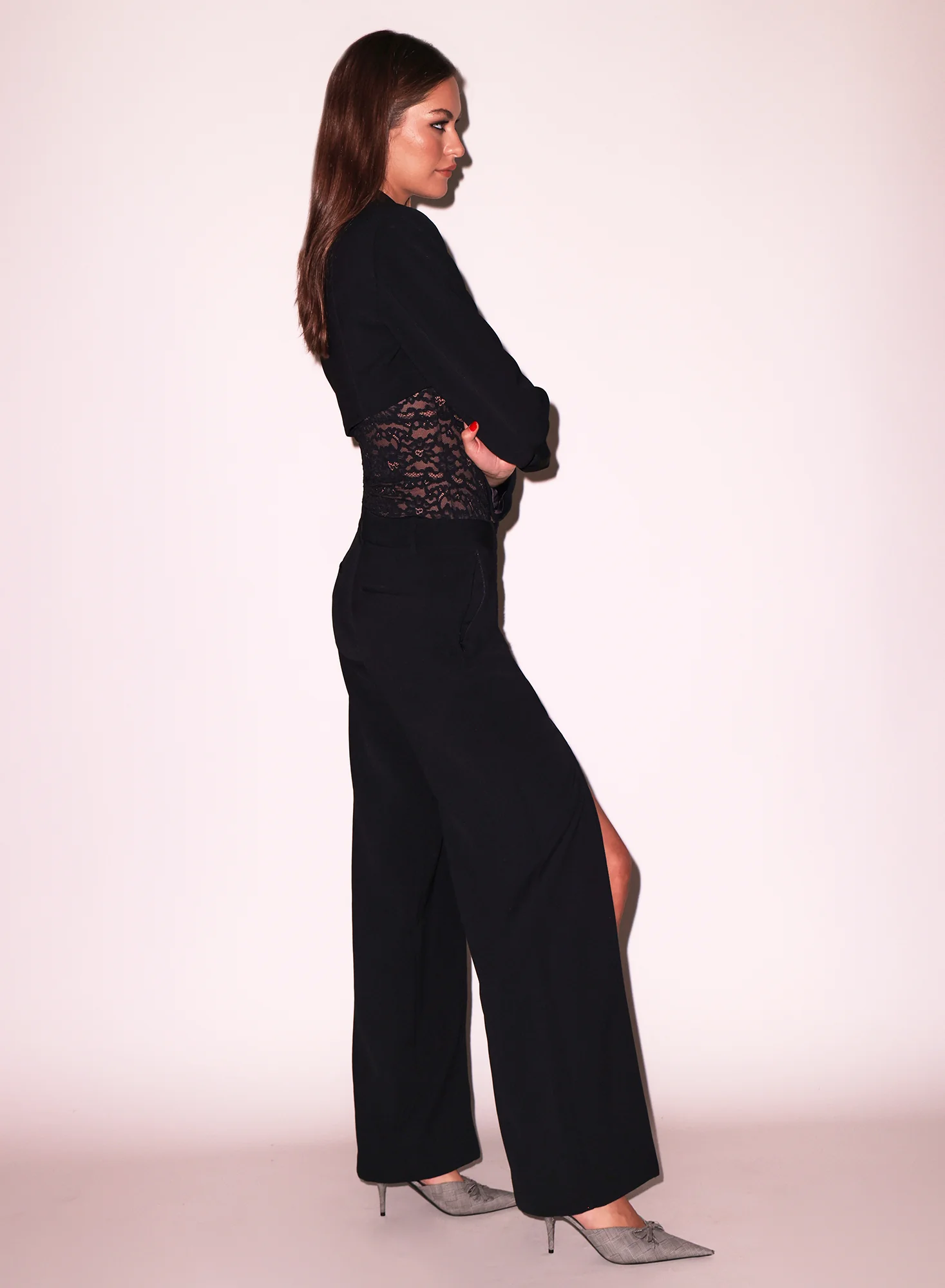 Our Cropped Blazer, with cutout heart-shaped front that sits above the chest. Back and side seam lands at the waist. Lined. Looks chic with the Charlotte Balconette Bodysuit and Zipper Split Hem Pant.