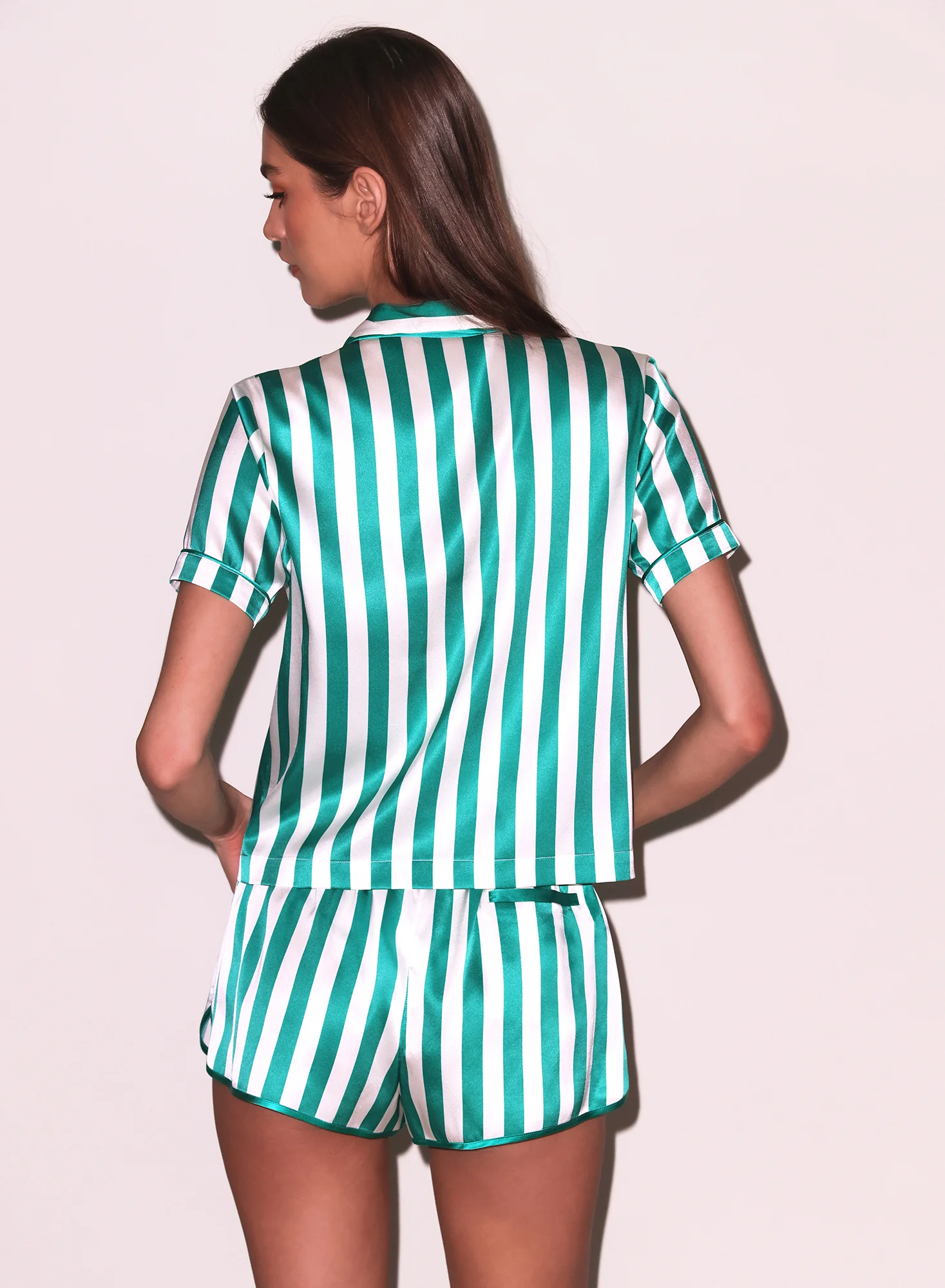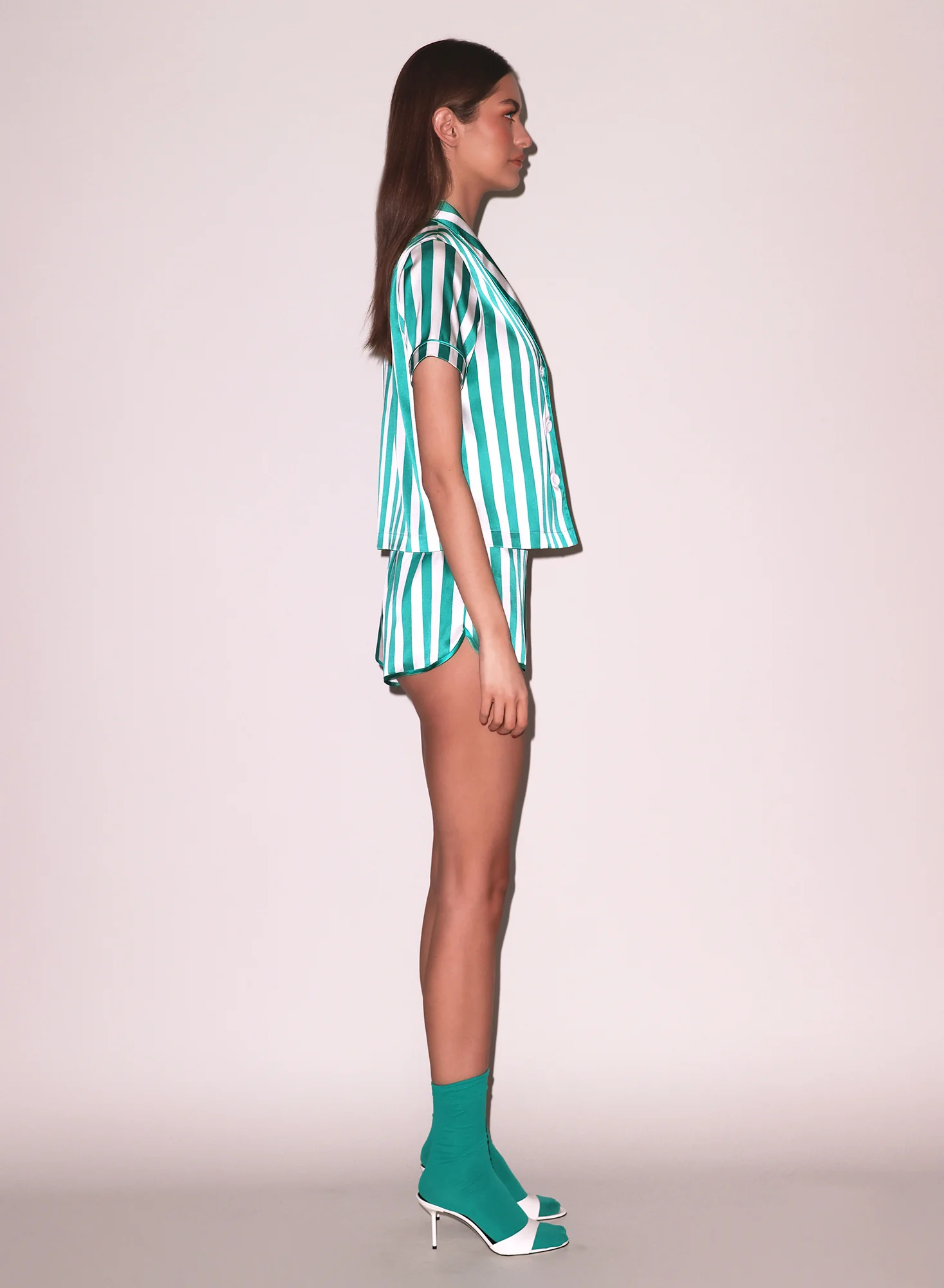 Our striped silk pajama short with piped trim and back pocket detail. Pair with the matching Riviera Stripe PJ Top for a playful set that works perfectly on the streets or in the sheets.