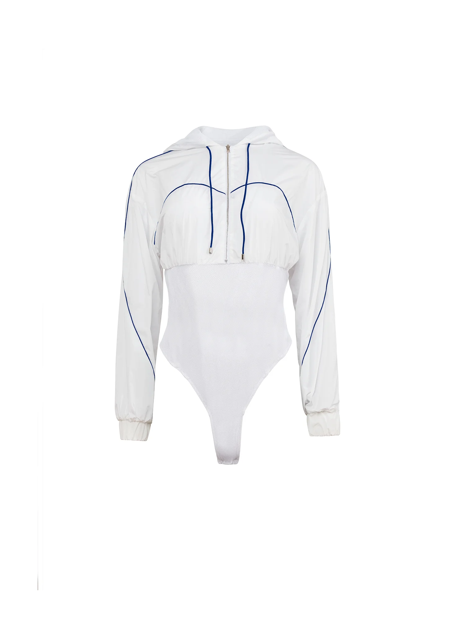 Get their hearts racing with the Trackstar Bodysuit, featuring nylon hooded top and relaxed long sleeves with breathable mesh body. Function front zipper, bottom snap closure and thong cut back. Take it out with the Denim Garter Skirt.