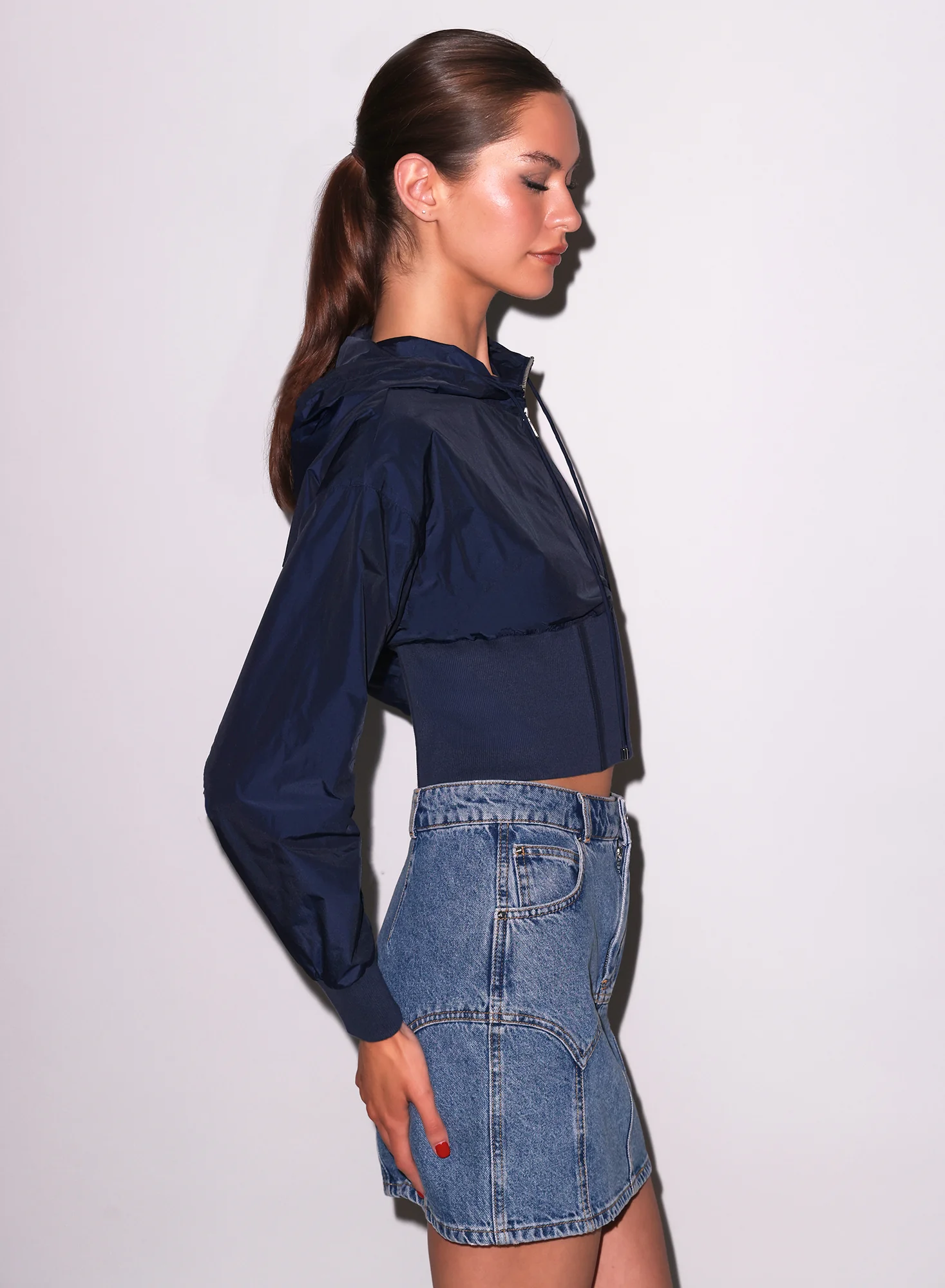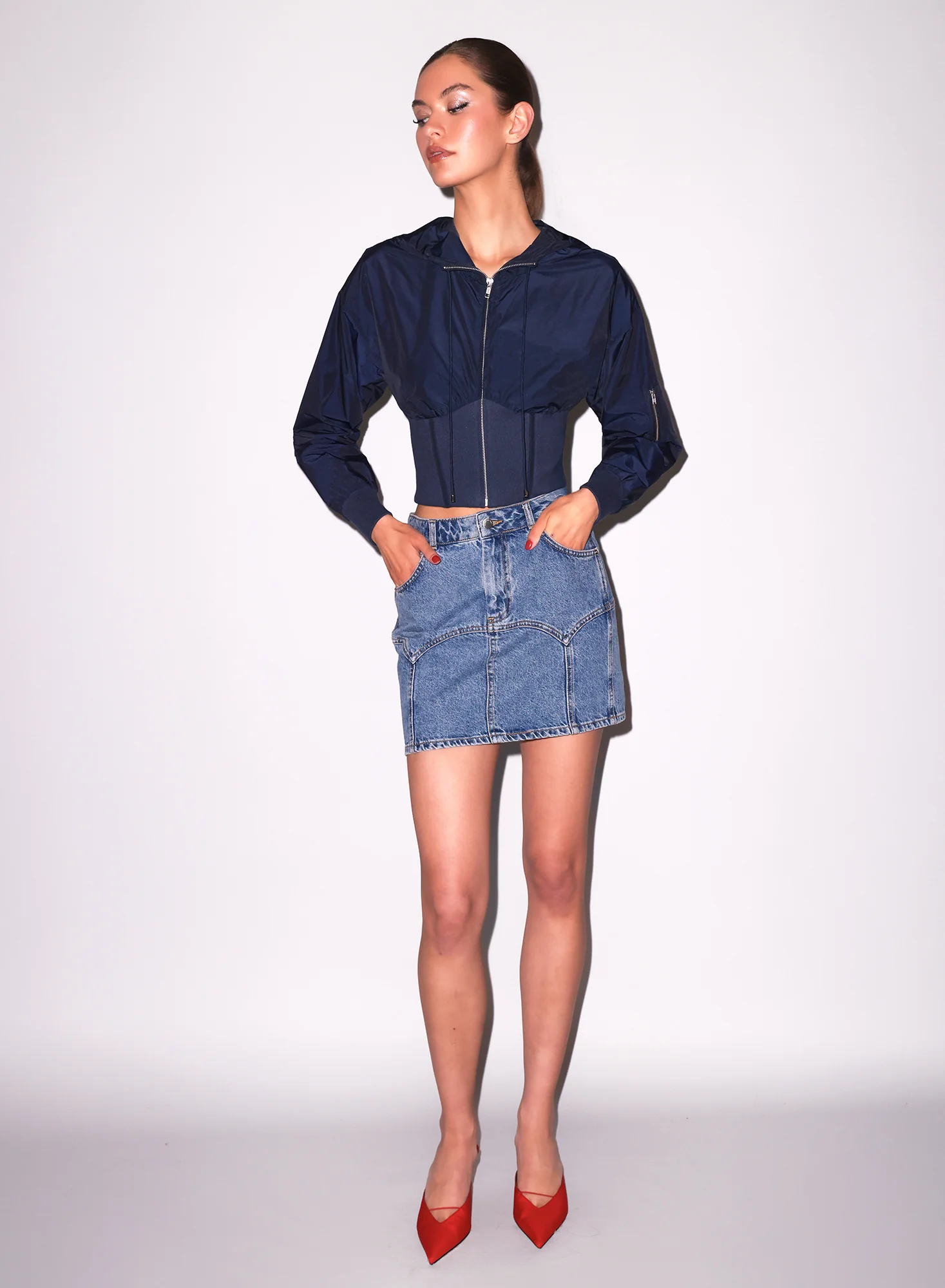 Get hearts racing in our Trackstar Jacket. Nylon track jacket with slight ruching at cups and corset seam details. Features relaxed sleeves with rib cuffs and back vent. Take it out with the Denim Garter Skirt.