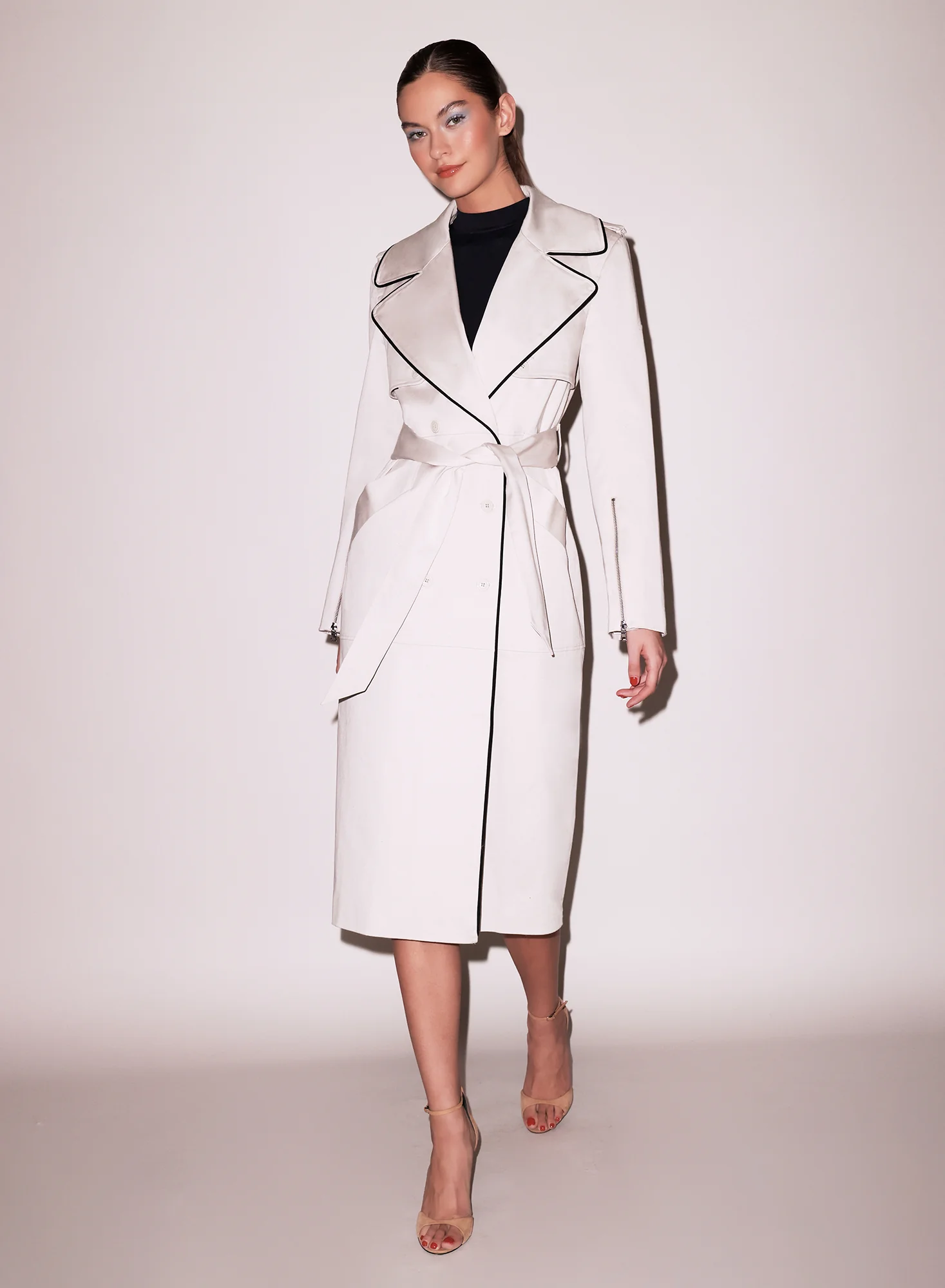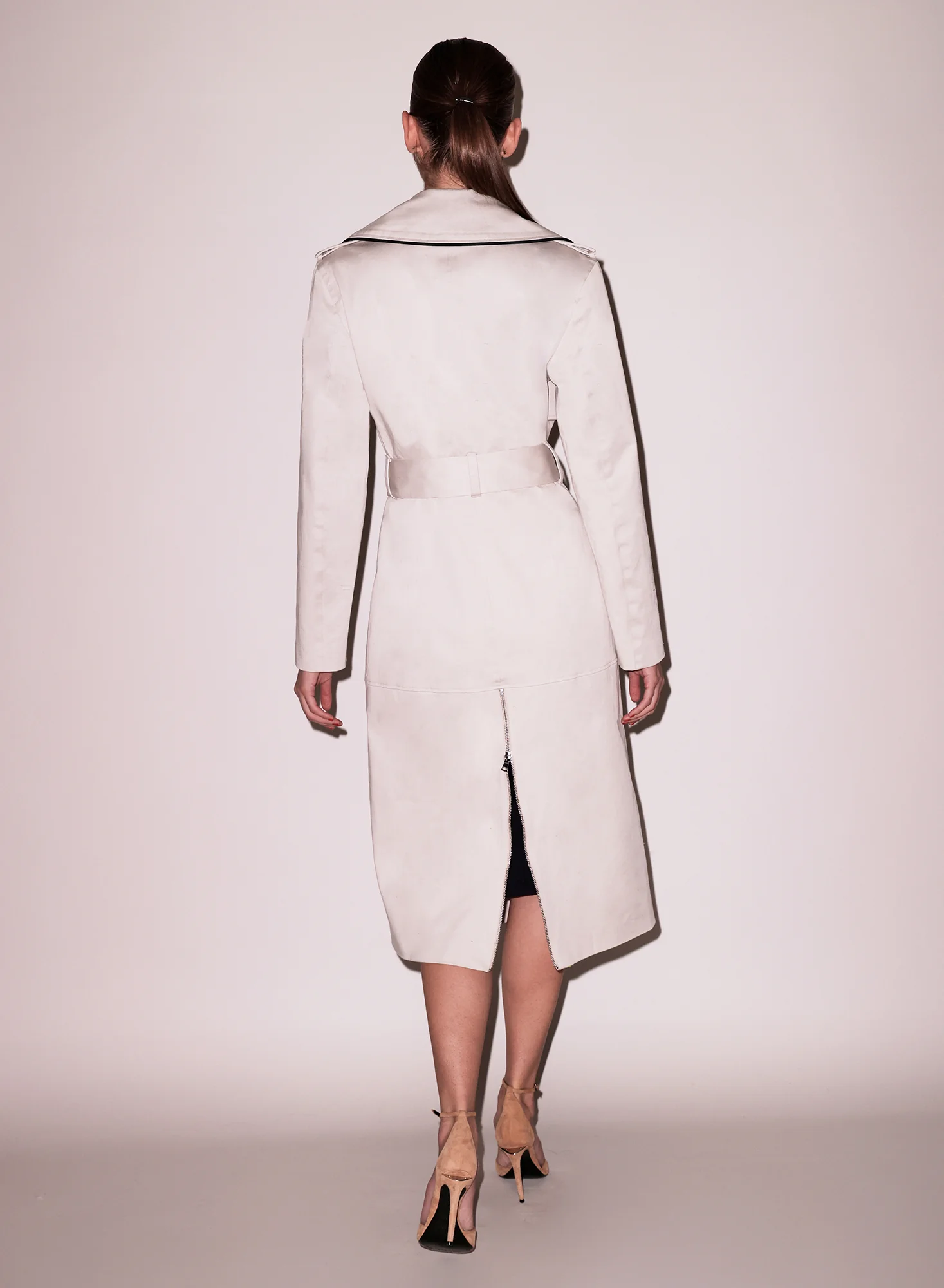 Our Twill Trench is an essential piece you will wear over everything (or nothing) this season. Features notch collar with double breasted front and silver zipper details on cuffs and vented back. Button closure with tie belt. Lined. Take it out layered over the Flared Corset Dress.