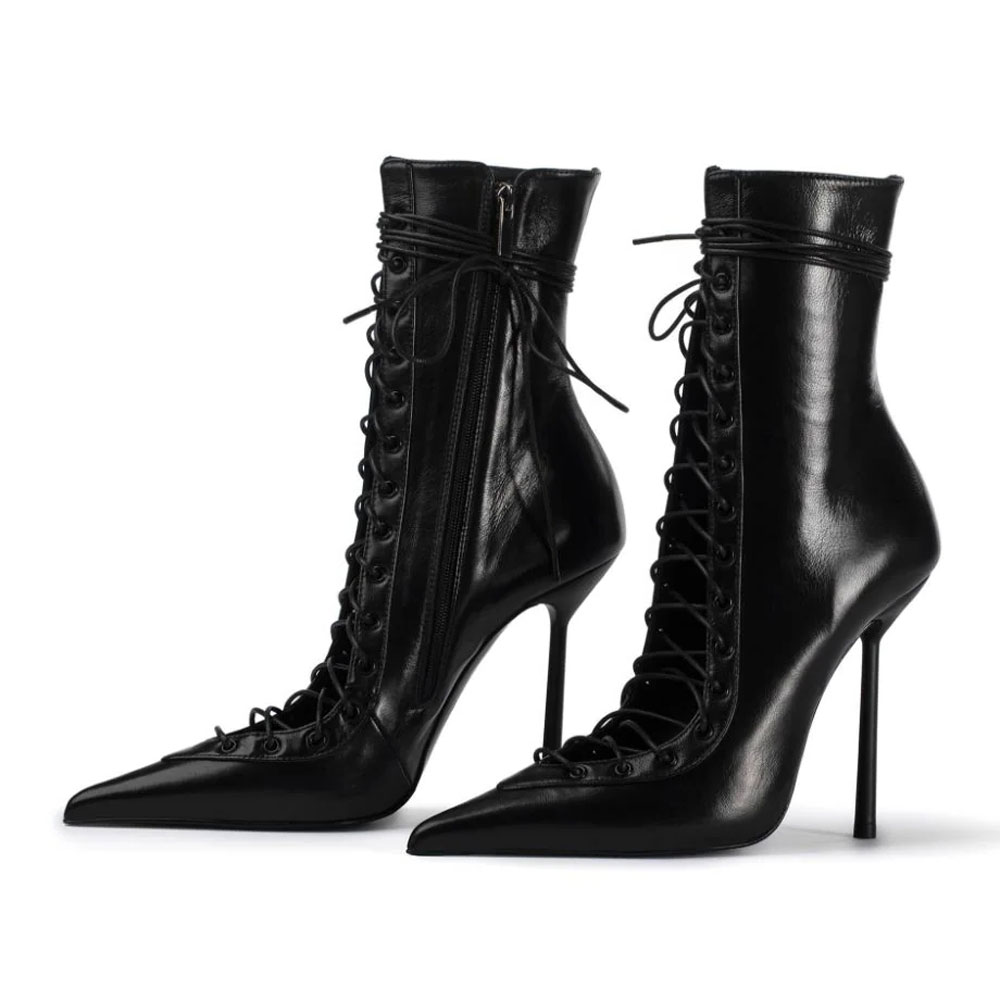 Step into retro chic with these black vintage pointed-toe booties, featuring a vamp cut design and lace-up closure. Elevate your style effortlessly with a touch of timeless sophistication. Color: Black Heel Type: Stiletto heel Heel Height: 4.72'' / 120 mm approx Product measurements were taken using size 8. Please note that measurements may vary by size. Toe: Pointed toe Vamp-cut design Lace-up design Side-zipper design Handcrafted US sizing. Fits true to size